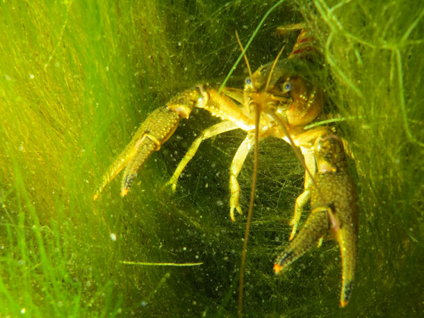 In 2 bis 5 Meter Tiefe treffen wir auf eine ausgeprägten Pflanzengürtel aus Tausendblatt, Rauhem Hornblatt und einer Astalgen. Hier treffen wir auf viele Barsche und einige Junghechte. In den Astalgenwiesen haben sich große Kamberkrebse, leicht erkennbar an ihren rostbraunen Abdomen, versteckt.