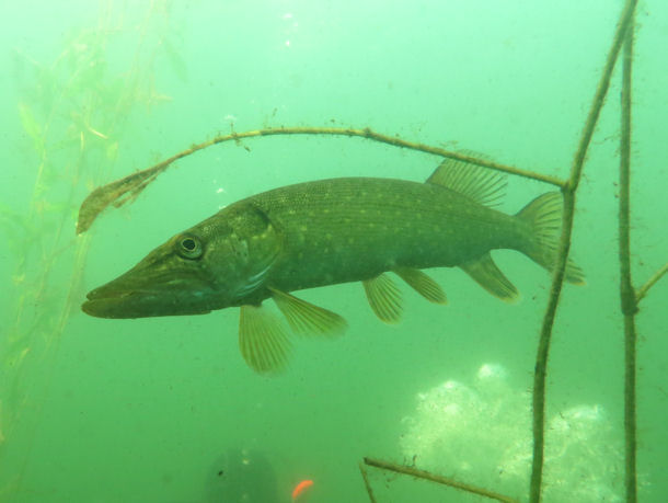 Im Uferbereich bis 4 m taucht man durch einen dichten Pflanzengürtel. Hier trifft man immer wieder auf große Hechte, die es auf Plötzen, Ukeleis und kleine Barsche Jagd machen. Auch Aale, Zander und Karpfen kommen im See vor.