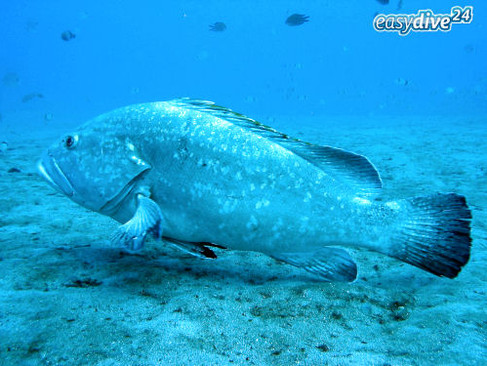 An der Felswand patrouillieren mehrere große Braune Zackenbarsche. Sie lassen den Taucher sehr nah herankommen und bieten ein herrliches Fotomotiv.
