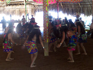 Plötzlich tauchen im satten Grün des Regenwalds einige Hütten mit Palmendächern auf. Sie sind Teil eines indigenen Dorfes, dessen Besuch zu den touristischen Highlights des Nationalparks gehört. Hier am Chagres River gibt es drei Siedlungen der Embera-Indianer, welche ihr Leben noch auf traditionelle Weise im Einklang mit der Natur führen. Wir legen an und barfüßige Indio-Kinder eilen uns neugierig entgegen. Ihre älteren Geschwister begrüßen uns mit Trommeln, Flöten und Rasseln.