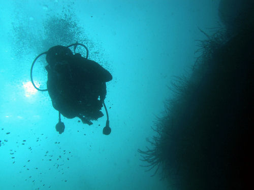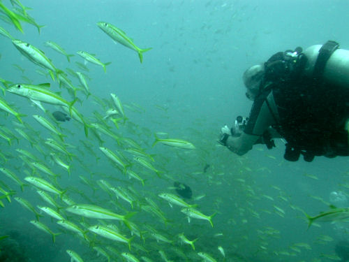 Das „Chinese Wreck“ wird vom Ufer aus betaucht und dient heute als künstliches Riff für unglaubliche Fischschwärme. Denn an dieser Schiffsruine ist nicht das Wrack selbst, sondern die Umgebung die Hauptattraktion. Zum Beispiel die seltene Kombination aus mannshohen Kelpwäldern, die es gerne kühl haben, und den imposanten Hartkorallen, die eher wärmere Gewässer bevorzugen. Zwischen beiden steht der Fisch so dicht, dass es manchmal scheint, dass man ihn fast mit den Händen wegschieben muss, um weiterzukommen.