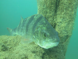 Während das Wasser im Bereich der Badestelle seicht auf etwa 7 bis 8 m abfällt, befindet sich gegenüber eine steile Abbruchkante. Bei guter Sicht kann man hier sogar ein wenig Drop-off-feeling verspüren. Auch einige Bäume stehen noch im Wasser. Zwischen den Ästen stehen häufig kapitale Hechte.