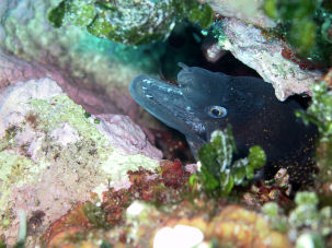 Auf einmal verschwand wieder die Sonne und es wurde richtig schummrig. Ich schaute ins freie Wasser, in die Richtung, in der eben noch die Sonne das Meer erleuchtete. Dort stand ein Schwarm Barrakudas. Langsam tauchten wir näher und ich versuchte, sie zu zählen. Es müssen mehr als 30 gewesen sein. Wie durch ein Wunder riss plötzlich die Wolkendecke auf und ließ die pfeilförmigen, langgestreckten Körper der Raubfische silbrig funkeln und aufblitzen. Nachdem wir die wundervolle Show noch eine Weile beobachtet hatten, schwammen wir weiter zum Riffhang. „Schröder“ sahen wir nicht, dafür kleine Zackenbarsche, Papageienfische, Drachenköpfe und eine kleine Muräne.