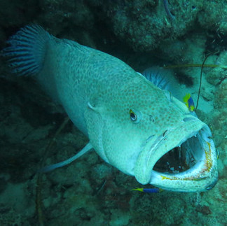 An einem kleinen Wrack entdeckte ich eine Putzerstation. Ein kapitaler Tiger-Zackenbarsch (Mycteroperca tigris) ließ sich gerade seine Zähne von kleinen Putzerfischen reinigen. Die Fische machten sich im weit geöffneten Maul des Zackenbarsches zu schaffen. Er ließ sich von uns Tauchern bei seiner Zahnpflege nicht stören.