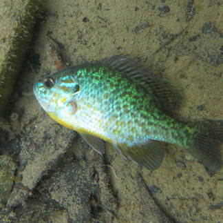 In kleinen, stehenden Nebenarmen traf ich auf Sonnenbarsche (Lepomis gibbosus). Diese ursprünglich aus dem östlichen Nordamerika stammende Fischart hat eine grünbraune Grundfärbung mit unregelmäßigen Querbinden und einem schwarzen und roten Fleck am Kiemendeckel. Bei Sonnenlicht scheinen die Fische bläulich-grün.